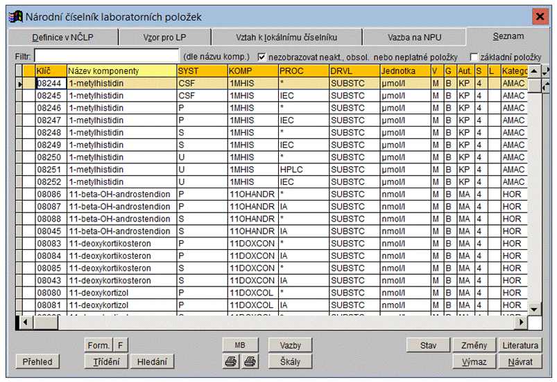 laboratorních položek“. Zobrazí se první položky NČLP - záložka Seznam.