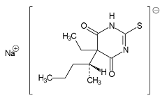 V léčivých přípravcích se vyskytuje jako směs sodného derivátu thiopentalu (C11H17N2NaO2S; Mr 264,32) a bezvodého uhličitanu sodného.
