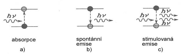 Slovo “laser” je akronym anglického názvu Light Amplification by Stimulated Emission of Radiation (zesílení světla stimulovanou emisí záření. Na obrázku je schematicky znázorněno, jak může dojít k tomu, že svě­telné vlnění o charakteristické frekvenci hn vstoupí do hmotného prostředí, vyvolá tam elektro­magnetickou poruchu u molekul, jež jsou v excitovaném stavu, a tím způsobí, že tyto mole­kuly vyšlou záření o stejné frekvenci n, jež je přesně ve fázi se zářením dopadajícím. Stimulo­vaná emise je vlastně pravým opakem absorpce. V klasickém případě, kdy při průchodu svě­telného vlnění prostředím dochází k absorpci, má prošlé světelné vlnění nižší amplitudu, avšak nezměněnou frekvenci i fázi. V případě, kdy nastává stimulovaná emise, má sice prošlé vlnění rovněž nezměněnou frekvenci i fázi, avšak jeho amplituda je vyšší.