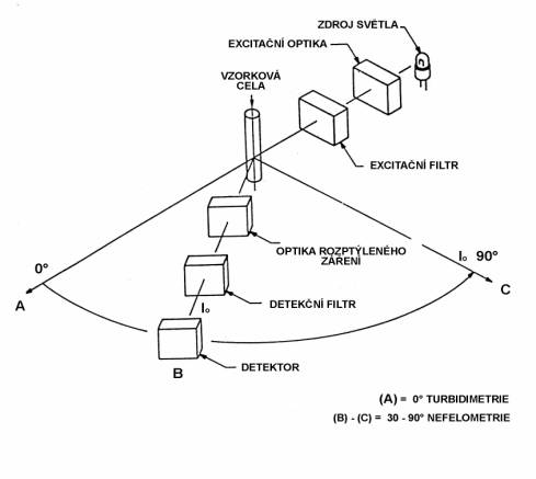 Pro přibližně stejné přístrojové vybavení obecně platí, že nefelometrie je asi o jeden řád citlivější než turbidimetrie. Schéma instrumentálního uspořádání je patrno z obrázku: