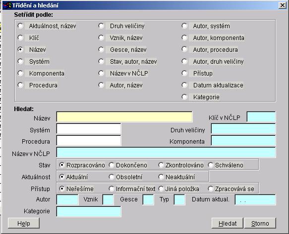 • Stav, autor, název - třídění dle: stavu položky, kódu autora, názvu komponenty, kódu systému a kódu procedury.