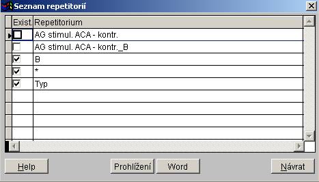Po stisknutí tlačítka "Repet" se objeví seznam repetitorií, které se váží k aktuální položce NČLP. Repetitoria lze prohlížet (pomocí Internet Exploreru - tlačítko Prohlížet), nebo s nimi pracovat pomocí Wordu (repetitoria lze prohlížet, tisknout).