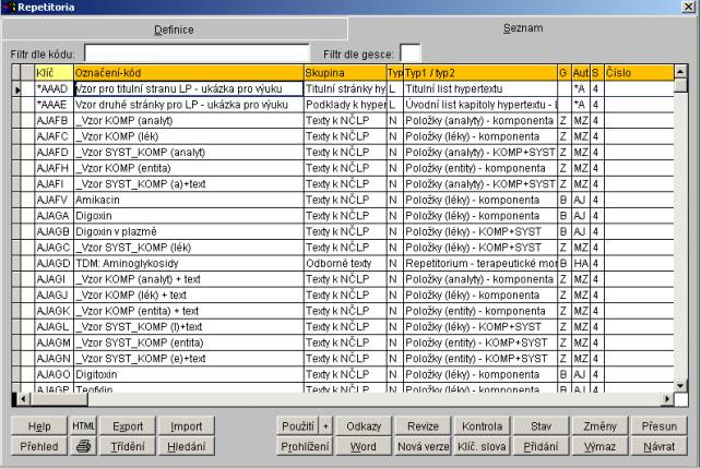 Záložka obsahuje i pro repetitoria sloupce "Verze", "Datum revize", které pro repetitoria nemají smysl. Stejně tak obsahuje tlačítko "Třídy", které je určeno pouze pro práci s dokumenty SLP.
