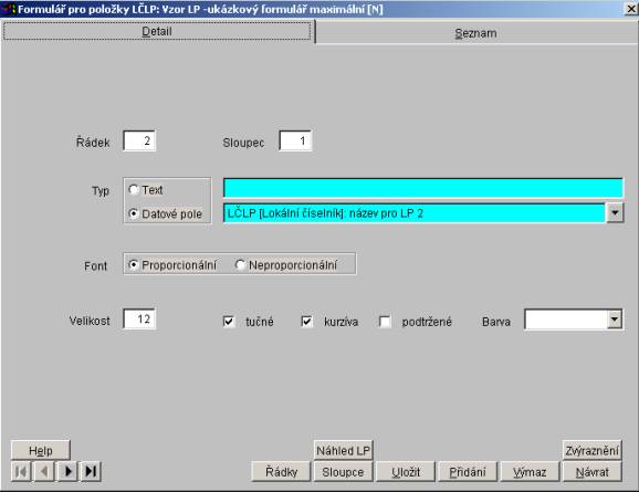 Popis tlačítek Help, Náhled LP, Zvýraznění, Řádky, Sloupce, Přidání, Výmaz a Návrat - viz Popis záložky Detail.