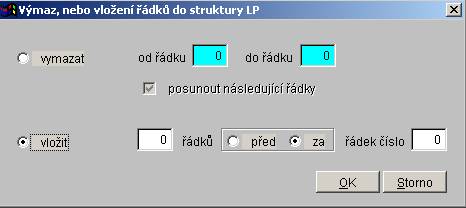 Pro hodnotu přepínače "Vložit" zadejte do pole "řádků" počet vložených řádků, vyberte hodnotu přepínače (před, za) a zadejte číslo řádku, ke kterému je přepínač (před, za) vztažen. Tlačítkem "OK" dojde k vložení zadaného počtu řádků před (za) "řádek číslo". Čísla ostatních řádků budou posunuta o vložený počet řádků. Tlačítkem "Storno" výmaz řádků odvoláte.