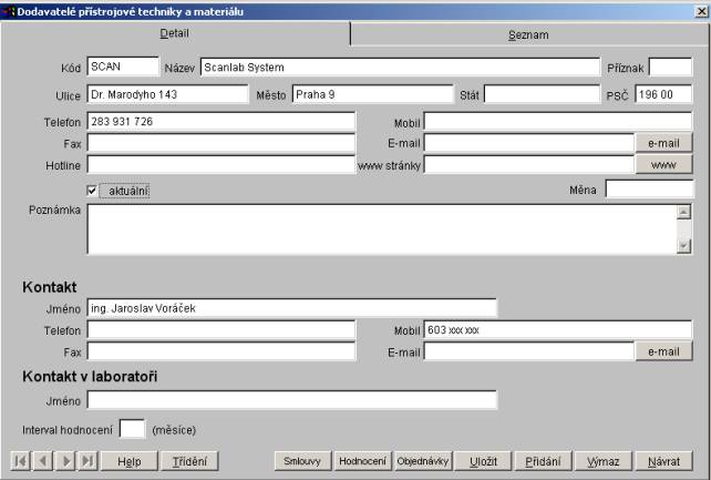 V záložce Detail lze zadat datum uzavření smlouvy, číslo smlouvy, předmět smlouvy, dokdy smlouva platí, příznak, zda byla smlouva prodloužena nebo k ní byl vypracován dodatek, místo uložení smlouvy a příznak, zda je smlouva dosud aktuální (jen aktuální smlouvy e mohou objevit v tiskové sestavě smluv, kterým končí platnost v zadaném období). Záložka obsahuje standardní tlačítka pro pohyb po záznamech, přidání nové smlouvy (Přidání), výmaz smlouvy (Výmaz) a ukončení dialogu pro práci se seznamem smluv aktuálního dodavatele (Návrat).