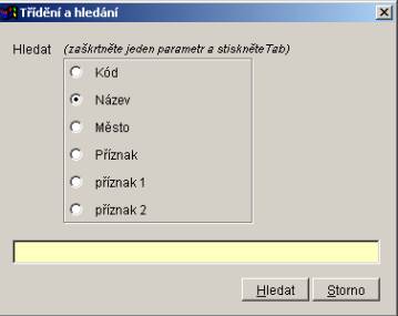 Po stisknutí tlačítka "Hledat" bude přepnuto třídění seznamu dodavatelů dle vaší volby. Pokud byl vyplněn hledaný řetězec, bude nalezen první záznam, který odpovídá hledanému řetězci a dialog Třídění a hledání bude ukončen. Nebyl-li žádný takový záznam nalezen, objeví se hláška "Nenalezeno" a dialog pro Třídění a hledání nebude ukončen. Lze změnit hledaný řetězec a hledání opakovat, nebo tlačítkem Storno dialog ukončit.