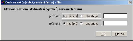 Po zadání podmínek pro filtrování bude seznam dodavatelů filtrován podle zadaných podmínek. Lze vybrat filtrovací podmínku pro položku "příznak 1" i pro položku "příznak 2". Pro obě položky lze zadat řetězec, pomocí kterého se bude seznam filtrovat a zda mají být zobrazeny záznamy, které tímto řetězcem začínají, nebo ho obsahují (velká a malá písmena se nerozlišují). Podmínky pro položky "příznak 1" a "příznak 2" se uplatní současně.