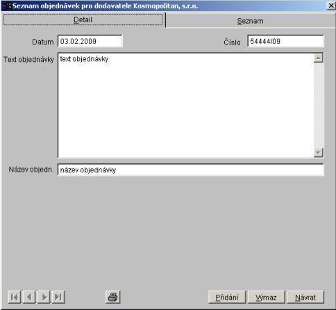 V záložce Detail lze zadat datum objednávky, její číslo, text objednávky a její název (netiskne se, pouze se zobrazuje v seznamu). Záložka obsahuje standardní tlačítka pro pohyb po záznamech, tlačítko pro tisk objednávky, přidání nové objednávky (Přidání), výmaz objednávky (Výmaz) a ukončení dialogu pro práci se seznamem objednávek pro aktuálního dodavatele (Návrat).