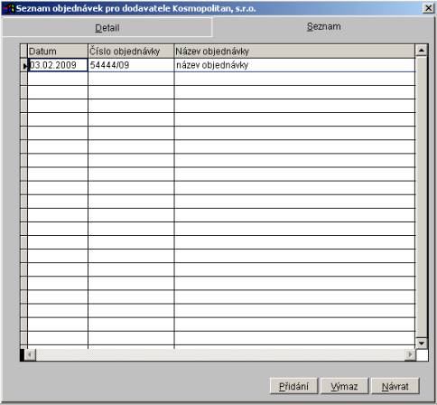 Ve sloupcích seznamu objednávek pro aktuálního dodavatele je zobrazeno datum objednávky, její číslo a název objednávky. Záložka dále obsahuje tlačítka pro přidání nové objednávky (Přidání), výmaz objednávky (Výmaz) a ukončení dialogu (Návrat).
