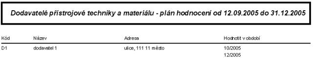 Zadává se období, na které chcete plán hodnocení dodavatelů vytisknout. Tiskovou sestavu lze zobrazit na monitoru (volba Preview), nebo vytisknout (volba Na tiskárnu). Sestava bude setříděna dle kódu dodavatele..