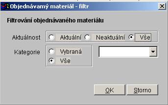 Po zadání podmínky pro filtrování bude seznam objednávaného materiálu filtrován podle zadané podmínky. Lze vybrat, zda mají být v seznamu zobrazeny aktuální, neaktuální nebo všechny materiály a zda mají být zobrazeny materiály všech kategorií nebo jen vybrané kategorie.
