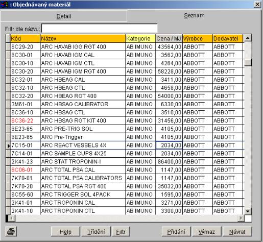 Záložka Seznam zobrazuje seznam všeho objednávaného materiálu. V záložce "Seznam" nelze žádné údaje opravovat