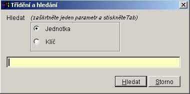 Po stisknutí tlačítka "Hledat" bude přepnuto třídění číselníku jednotek dle vaší volby. Pokud byl vyplněn hledaný řetězec, bude nalezen první záznam, který odpovídá hledanému řetězci a dialog Třídění a hledání bude ukončen. Nebyl-li žádný takový záznam nalezen, objeví se hláška "Nenalezeno" a dialog pro Třídění a hledání nebude ukončen. Lze změnit hledaný řetězec a hledání opakovat, nebo tlačítkem Storno dialog ukončit.