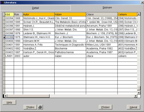 Při aktivaci dialogu je zobrazena záložka Seznam. Seznam je setříděn vzestupně podle kódu literatury