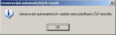 Po odpovědi "OK" na tento dotaz bude odstartováno generování vazeb. Je zobrazována informace o průběhu generování. Po ukončení generování automatických hlášek mezi položkami LČLP je zobrazena hláška o ukončení generování.