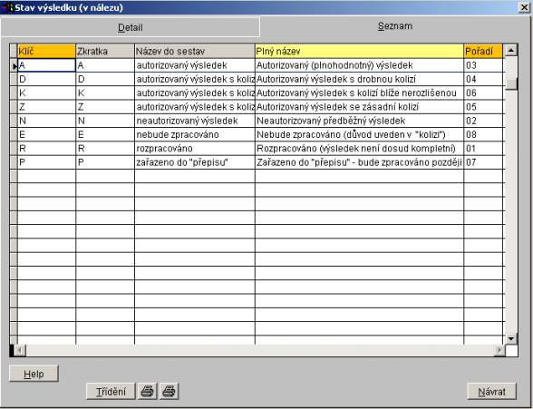 Popis tlačítek Help, Třídění a Návrat - viz Popis záložky Detail.