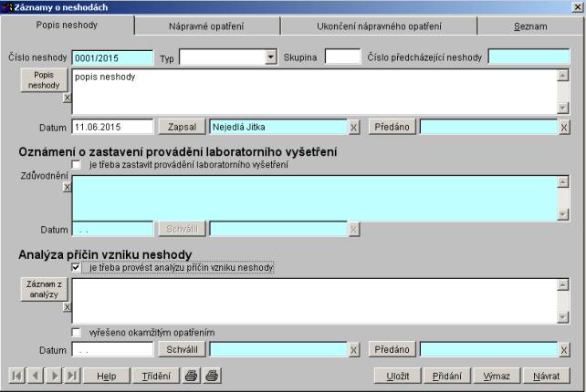 Schválil - tlačítko pro výběr pracovníka laboratoře, který schválil, že je třeba provést analýzu příčin vzniku neshody. Schválení se týká i případného vyřešení neshody okamžitým opatřením. Vybírá se ze seznamu pracovníků laboratoře.