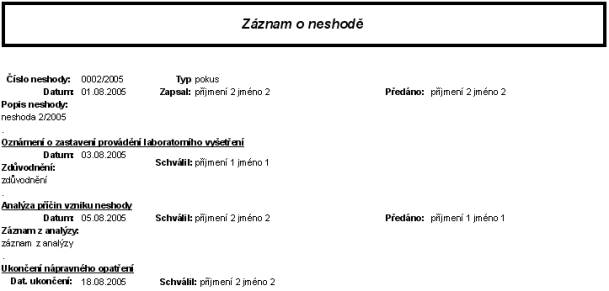 aktuálního záznamu o neshodě. Tiskovou sestavu lze zobrazit na monitoru (volba