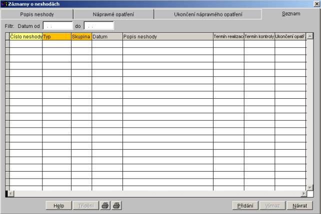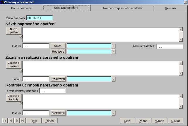 Popis tlačítek Help, Třídění, Přidání a Výmaz - viz Popis záložky Popis neshody.