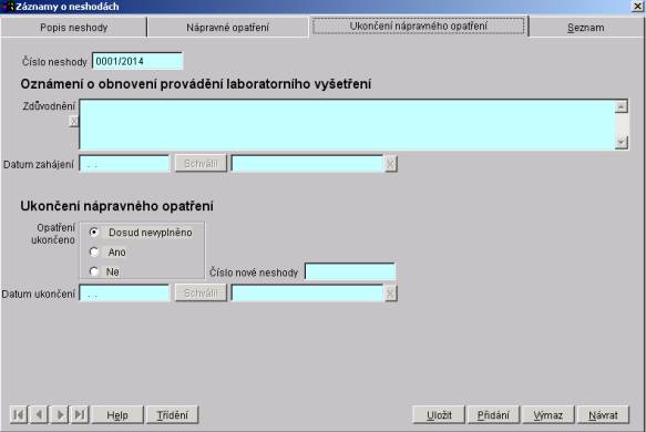 navazuje na záložku "Nápravné opatření". Obsahuje údaje o ukončení