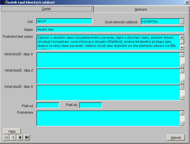 Detail obsahuje základní informace o aktuálním typu klinické události. Záložka
