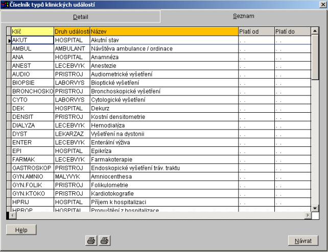klinických událostí (obecné informace o práci se záložkou Seznam - viz Dialogy programu SLP).