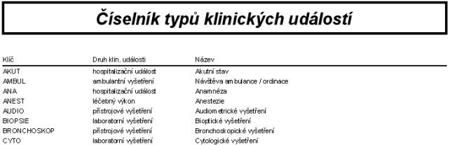 číselníku typů klinických událostí (sestava v přehledné tabulkové formě