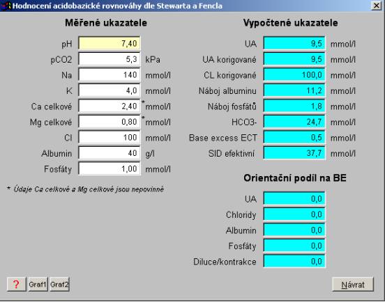 Dialog pro výpočet parametrů acidobazické regulace dle Stewarta a Fencla.