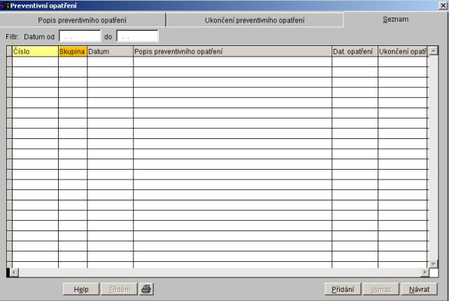 Dialog pro práci se seznamem záznamů o preventivních opatřeních (dále jen PO) má tři záložky - Popis preventivního opatření, Ukončení preventivního opatření a Seznam. První dvě záložky obsahují chronologický popis řešení PO. Záložka Seznam zobrazí seznam všech záznamů o PO.