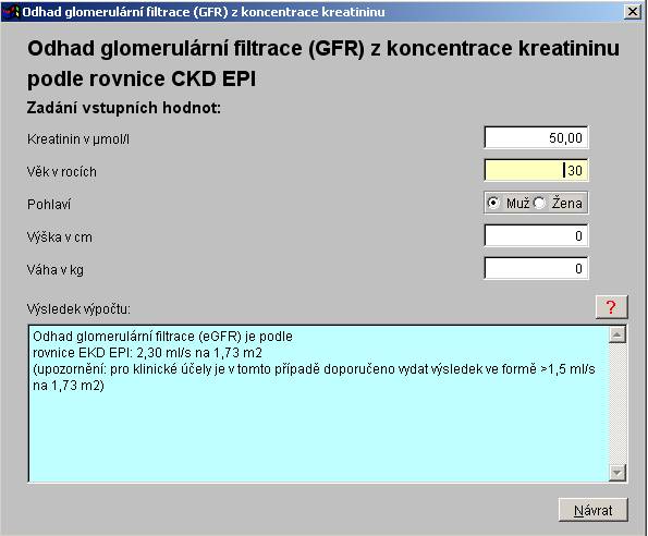 Dialog pro výpočet odhadu glomerulární filtrace (GFR) z koncentrace kreatininu podle rovnice CKD EPI