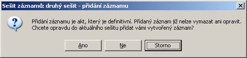 Dialog vás upozorňuje, že přidání záznamu je definitivní akt a že přidaný záznam již nelze opravit ani smazat. Volbou "Ano" přidáte záznam do sešitu. Volba "Ne" ukončí dialog pro přidání záznamu a žádný záznam nebude přidán (rozepsaný text se ztratí). Volba "Storno" vás vrátí zpět do dialogu pro přidání záznamu.