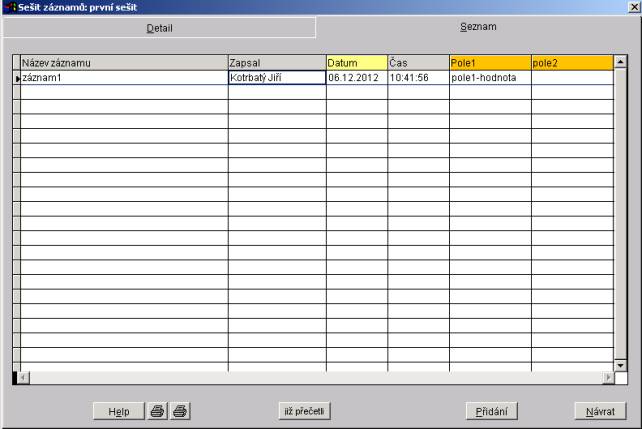 Dialog pro práci se seznamem záznamů má dvě záložky - Detail a Seznam. Záložka Detail název záznam, datum a čas jeho vytvoření a vlastní text záznamu.Záložka Seznam obsahuje seznam všech záznamů v aktuálním sešitě záznamů.