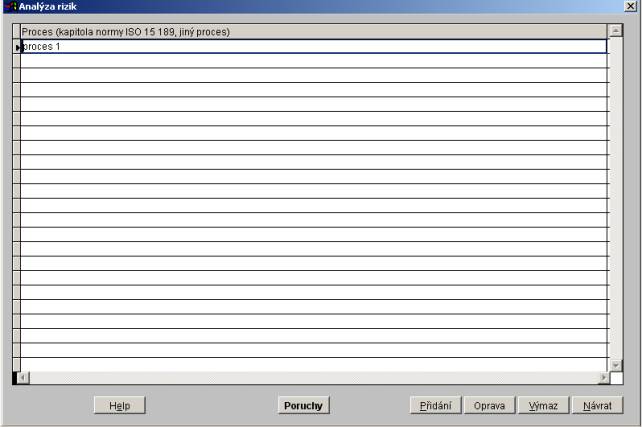 Na první úrovni agendy Analýza rizik je zobrazen seznam procesů. Seznam nelze editovat přímo. Je nutné použít funkční tlačítka pod seznamem.