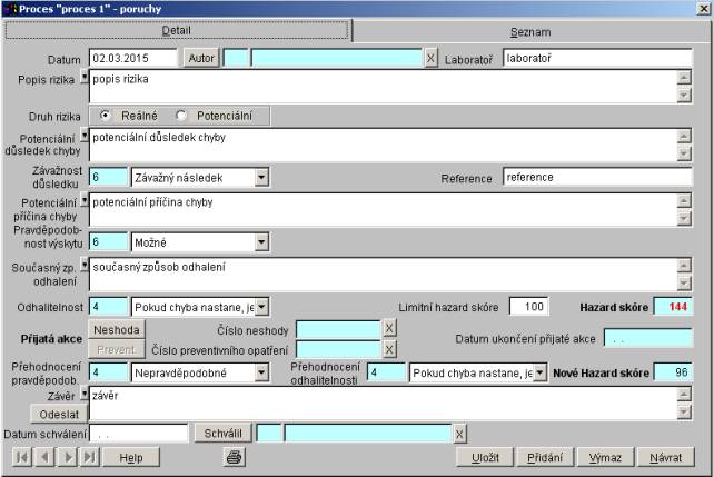 Nové hazard skóre - automaticky spočítaná hodnota (nové hazard skóre po skončení přijaté akce), která odpovídá hodnotám vybraným z číselníků "Závažnost důsledku", "Přehodnocení pravděpodobnosti" a "Přehodnocení odhalitelnosti" (součin indexů). Pokud je nové hazard skóre poruchy vyšší než limitní hazard skóre, je zobrazeno červeně.