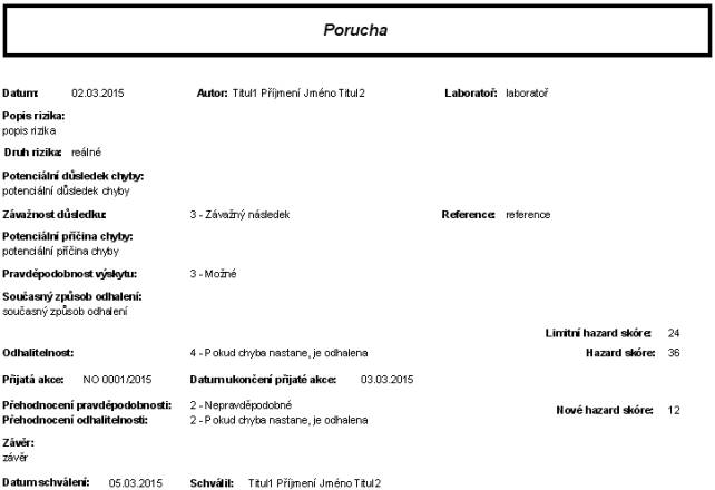 Hazard skóre - automaticky spočítaná hodnota, která odpovídá hodnotám vybraným z číselníků "Závažnost důsledku", "Pravděpodobnost výskytu" a "Odhalitelnost" (součin indexů). Pokud je hazard skóre poruchy vyšší než limitní hazard skóre, je zobrazeno červeně.