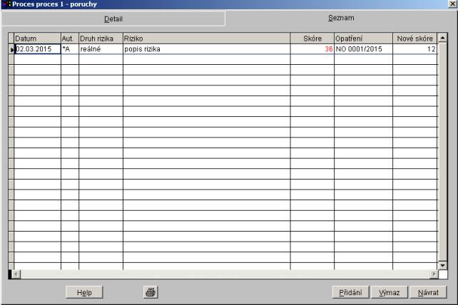 Záložka Seznam zobrazuje seznam všech poruch pro aktuální proces. V záložce Seznam nelze žádné údaje opravovat. Seznam e tříděn sestupně podle data.
