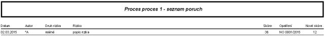 Agenda Analýza rizik eviduje procesy a poruchy v nich. Agenda má dvě úrovně. První úroveň obsahuje seznam procesů. Druhá úroveň obsahuje seznamy poruch pro jednotlivé procesy.