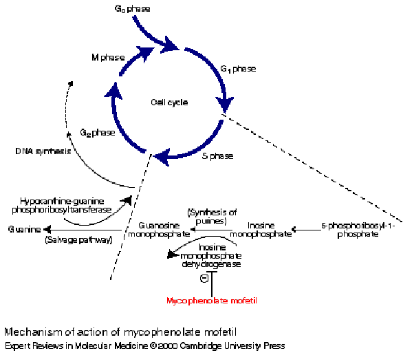 – kyselinu mykofenolovou (MPA), kterou již lze detekovat a kvantitativně měřit (na rozdíl od MMF) v plazmě, kde je vázáná