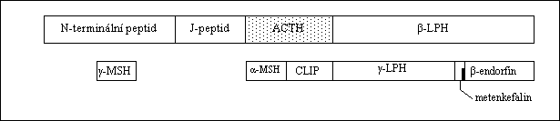 Posttranslační štěpení proopiomelanakokortinu (POMC). ACTH: adrenokortikotropní hormon, LPH: lipotropní hormon, MSH: melanocyty stimulující hormon CLIP: corticotropin like intermediate lobe peptide.