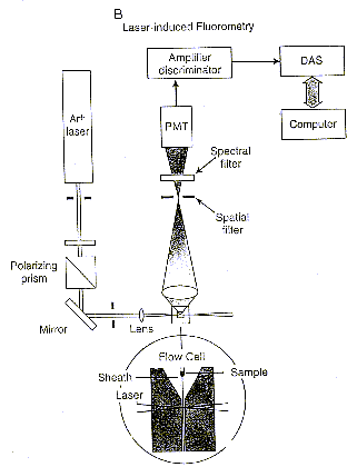 využívá především v průtokové cytometrii (kombinuje LIF a rozptyl světla