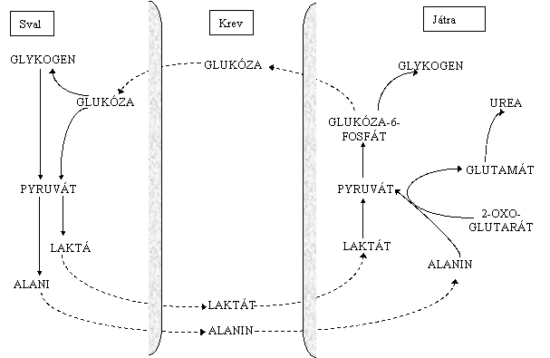 vzniklý pyruvát je transaminován na alanin. Tento cyklus má význam především