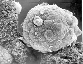 Jehličkovité krystaly močanu amonného sdružené do kulovitých agregátů, elektronový mikroskop, zvětšeno 390x