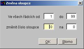 Do polí "Ve všech řádcích od", "do" zadejte rozsah řádků, kterých se má změna týkat. Do pole "změnit číslo sloupce" (s1) zadejte číslo sloupce, které má být změněno. Do pole "na" (s2) zadejte novou hodnotu čísla sloupce. Tlačítkem "OK" dojde v rozsahu zadaných řádků ke změně čísla sloupce s1 na s2. Tlačítkem "Storno" hromadnou změnu čísla sloupce odvoláte.