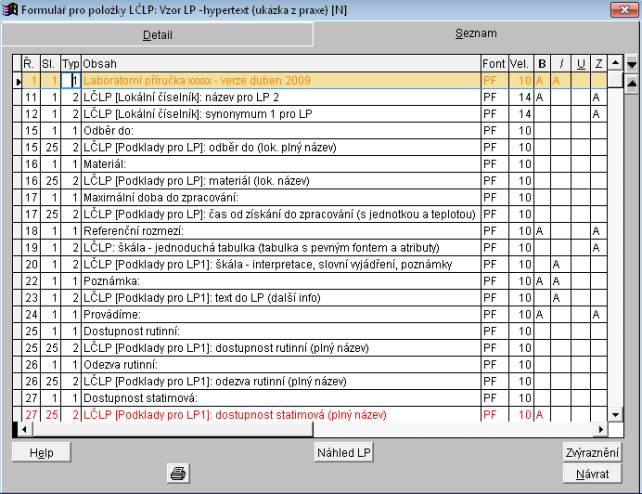 Pod pojmem zvýraznění je chápán nástroj, který dovolí nadefinovat barevné rozložení podsvitu jednotlivých řádků formulářů. Jedná se několikastupňový nástroj. Zde lze nadefinovat podsvit na úrovni jednotlivých řádků formuláře. Výsledek nadefinovaného zvýraznění lze ihned zkontrolovat pomocí tlačítka "Náhled LP". Podrobně je zvýraznění vysvětleno v dokumentu "Zvýraznění laboratorní příručky" (včetně ukázek "zvýrazněných" dokumentů).