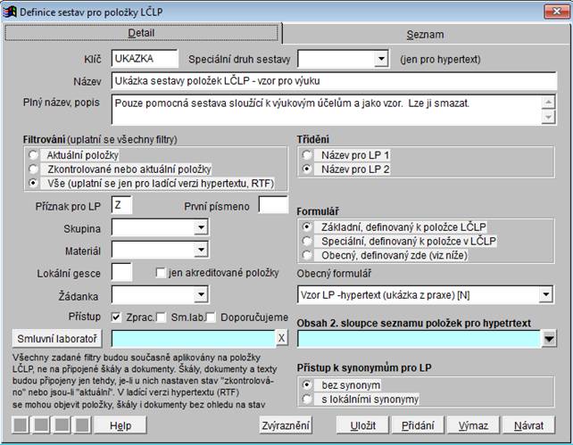 • bez synonym - při generování hypertextu, resp. zpracování seznamu položek LČLP do RTF souboru nad touto sestavou nebudou použita synonyma názvů lokálních položek.