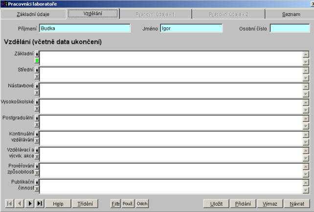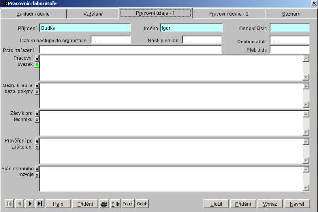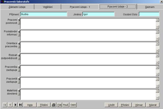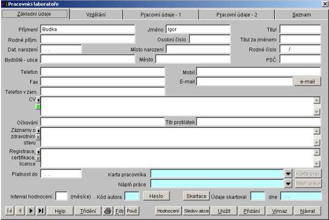 Dialog pro práci se seznamem pracovníků laboratoře má čtyři záložky - Základní údaje, Vzdělání, Pracovní údaje a Seznam. Záložka Základní údaje obsahuje základní informace o aktuálním pracovníkovi. Záložka Vzdělání obsahuje informace o vzdělání pracovníka. Záložka Pracovní údaje obsahuje informace o pracovníkovi důležité z hlediska jeho práce. Záložka Seznam zobrazí seznam všech pracovníků laboratoře.
