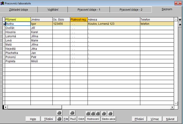 Záložka Seznam zobrazuje seznam všech pracovníků laboratoře. V záložce "Seznam" nelze žádné údaje opravovat