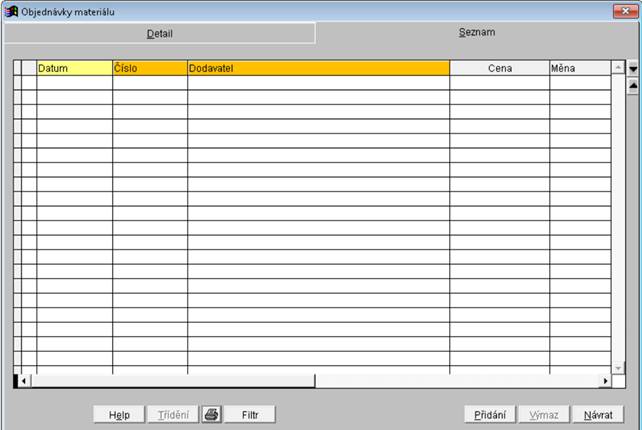 Dialog pro práci s objednávkami materiálu má dvě záložky - Detail a Seznam. Záložka Detail obsahuje informace o aktuální objednávce. Záložka Seznam zobrazí seznam všech objednávek materiálu.