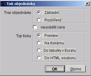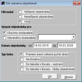 Při tisku seznamu objednávek, lze nastavit filtrování a typ tisku: